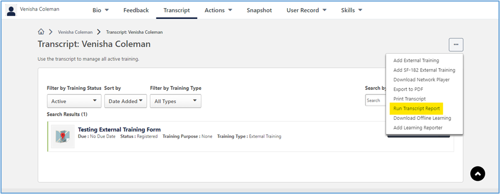 Note: If a user is attempting to get a report of their transcript, we can navigate him/her to the 'Options' button located on the user's 'View Your Transcript'/'Transcript' page. From the drop-down, you can advise the user to select 'Run Transcript Report'. This transcript report feature has different filter options the user can utilize.