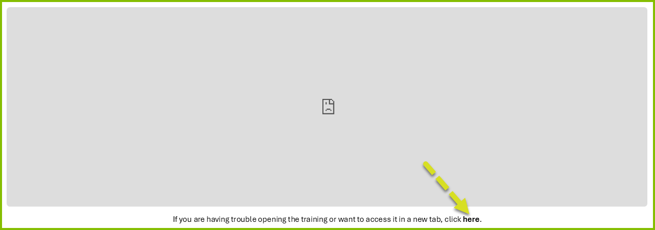 We apologize for the error icon you’re receiving. In this case, kindly try clicking on the text - click “here” (highlighted under the image). This should allow the training to open in a new tab.